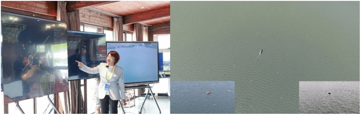 随后,专家组与基金委领导一同前往位于淀山湖的无人艇集群协同护航高价值目标的演示现场,考察了20艘无人艇集群在护航高价值目标遇到入侵无人艇集群(5艘)时,开展抵近侦察,识别入侵目标及危险等级,实施跟踪驱离、协同围捕,成功实现典型海洋场景应用验证,综合展示了项目理论与关键技术突破及性能指标显著提升的实施效果。